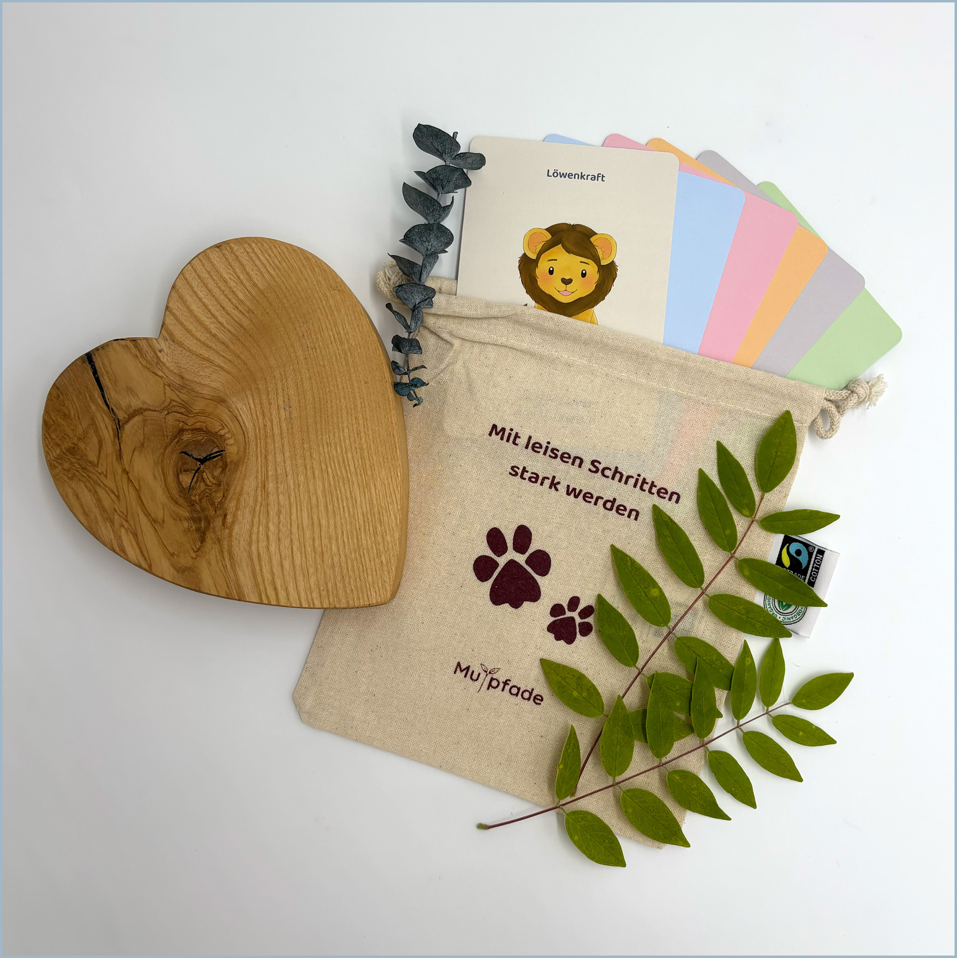 Die 36 Impulskarten begleiten diese Reise. Manche gehören zu bestimmten Momenten im Buch, andere dürfen frei gewählt werden, als kleine Mutanker im Alltag, beim Aufwachen, Einschlafen oder einfach zwischendurch. Der Beutel bewahrt sie behutsam auf, ein stiller Begleiter für kleine und große Mutpfade.